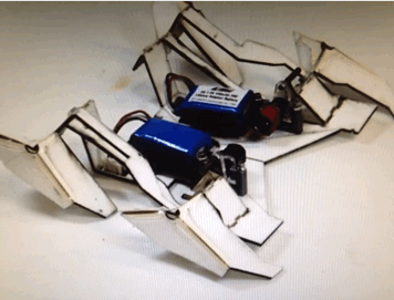 一旦電源開始供電,微控制器就會經(jīng)過一系列操作對銅質(zhì)折印進(jìn)行加熱,然后四足便折疊形成。折疊完成后電動機(jī)轉(zhuǎn)動齒輪,機(jī)器人便可行走。如果集成適當(dāng)?shù)碾娐烦绦?,機(jī)器人也可以完成轉(zhuǎn)彎。