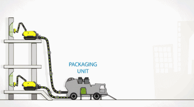 通過內(nèi)部的高壓水槍,對吸進(jìn)去的混合物進(jìn)行分離。這款水泥回收機(jī)器人還能將被分離后的砂石和水泥直接打包回收,轉(zhuǎn)變?yōu)樾碌慕ㄖ昧?。無需任何加工就可以實(shí)現(xiàn)建筑物材料的再利用。
