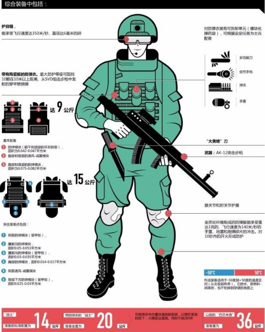 它由10個(gè)不同子系統(tǒng)組成的模塊化系統(tǒng),可根據(jù)作戰(zhàn)情況,氣候條件和其他參數(shù)而靈活變化。該戰(zhàn)斗套裝包括40多個(gè)模塊,包括槍械,瞄準(zhǔn)系統(tǒng),個(gè)人裝甲保護(hù)套裝,基于格洛納斯衛(wèi)星導(dǎo)航系統(tǒng)的通信和導(dǎo)航設(shè)備。