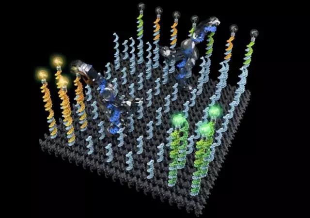 對DNA機器人進行測試的場所是一個58納米×58納米的大分子表面,上面設置有上百個“樁子”。這些樁子是DNA機器人得以行走的重要幫手。每個樁子實則也是一條DNA單鏈,它們與DNA機器人的“腿”和其中一只“腳”堿基互補。換而言之,機器人DNA會和樁子結合,相當于機器人“踩”在了樁子上。