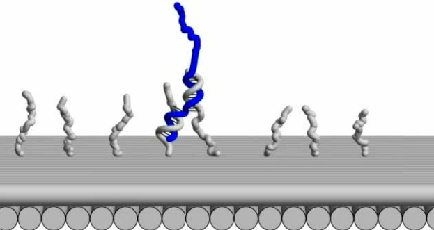 但怎么在不同的樁子之間移動呢?別忘了,DNA機器人有兩只腳,當一只腳和樁子結合時,另一只腳是可以自由活動的。隨機的分子波動會使得自由的那只腳“夠”到另一個樁子,進行下一次的配對,實現(xiàn)空間移動。從中,此前的那只腳隨之恢復自由。在這一循環(huán)往復的過程中,DNA機器人可以在沒有能量供應的情況下,進行隨機的移動。