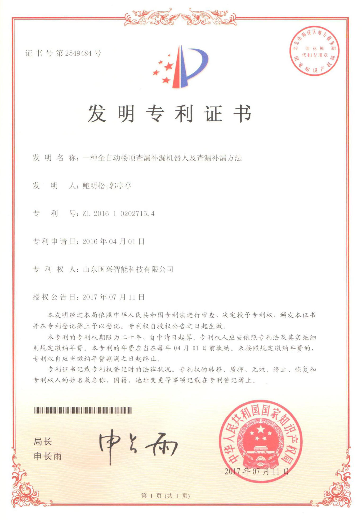 2017.07.11 山東國興智能科技申請的專利-《一種全自動(dòng)樓頂查漏補(bǔ)漏機(jī)器人及查漏補(bǔ)漏方法》申請成功!經(jīng)過國興智能科技全體成員的不斷努力,現(xiàn)已獲得發(fā)明專利13項(xiàng),實(shí)用新型30項(xiàng),外觀專利3項(xiàng),計(jì)算機(jī)軟件著作權(quán)5個(gè)!