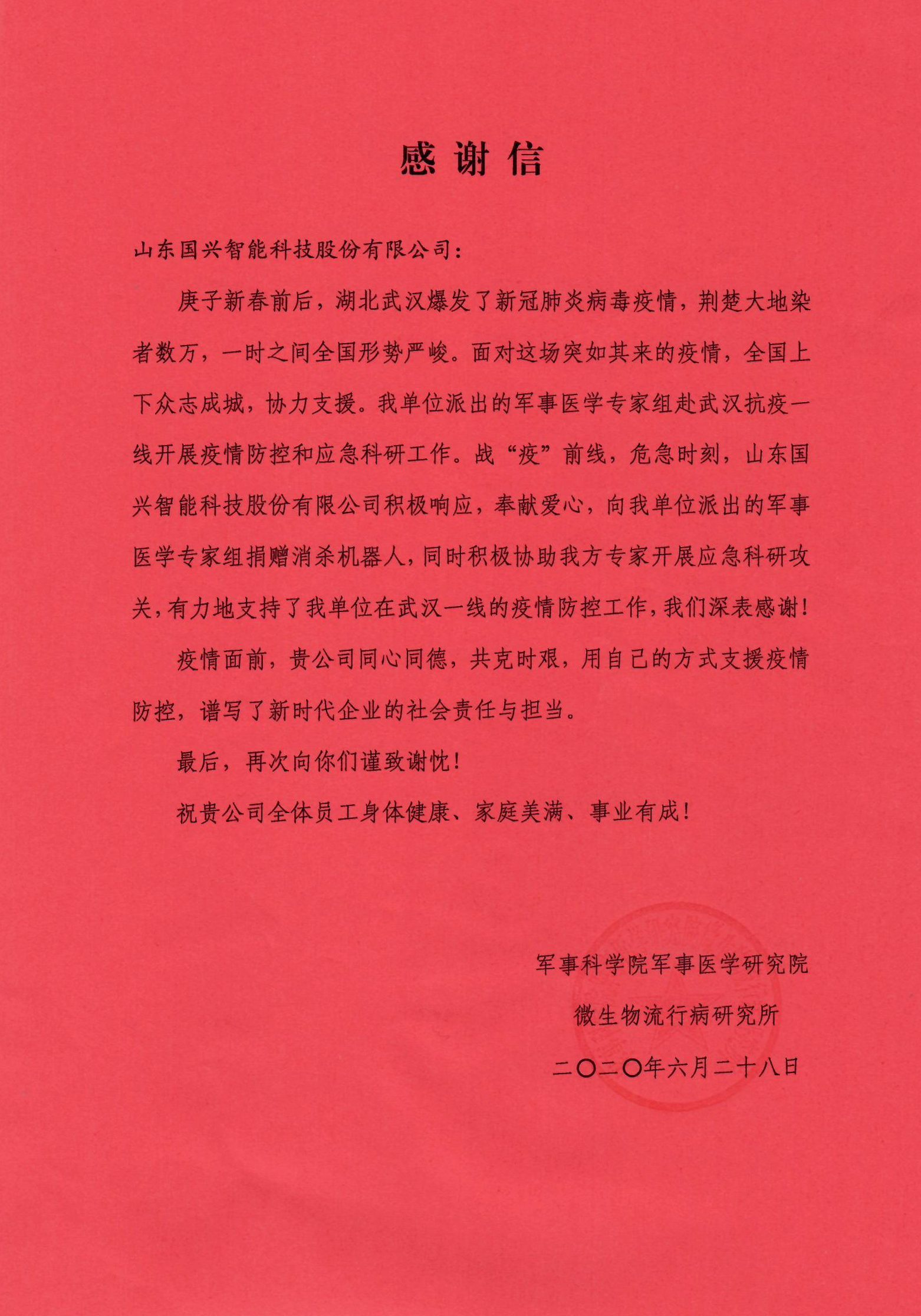 近日,我司收到來自軍事科學(xué)院軍事醫(yī)學(xué)研究院微生物流行病研究所的感謝信。這是對國興智能疫情期間積極響應(yīng)、奉獻(xiàn)愛心的肯定。