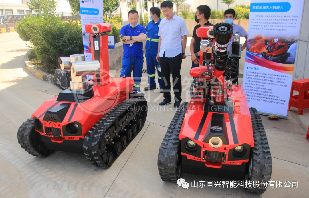 在消防演練開始前,國(guó)興智能防爆消防滅火偵察機(jī)器人吸引了受邀參加此次演練的領(lǐng)導(dǎo)、企業(yè)負(fù)責(zé)人等駐足,公司有關(guān)負(fù)責(zé)人對(duì)消防機(jī)器人的產(chǎn)品性能、產(chǎn)品優(yōu)勢(shì)、應(yīng)用場(chǎng)景等進(jìn)行詳細(xì)的講解,各位領(lǐng)導(dǎo)對(duì)產(chǎn)品連連稱贊。