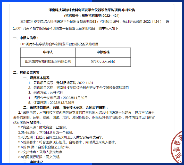 新年伊始,國興智能傳來喜訊,成功中標河南科技學院綜合科創(chuàng)研發(fā)平臺儀器設備采購項目,中標金額為576萬元。